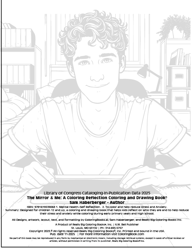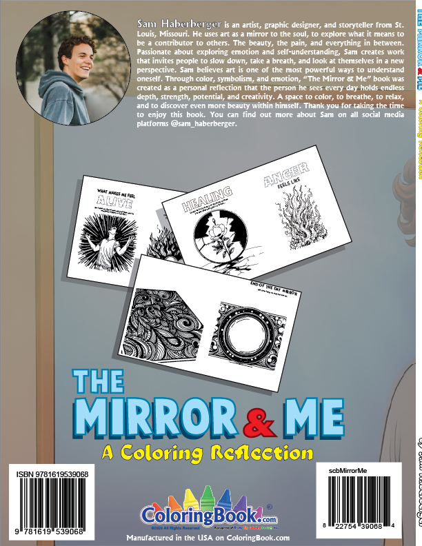Sam Haberberger is an artist, graphic designer, and storyteller from St. Louis, Missouri. He uses art as a mirror to the soul, to explore what it means to be a contributor to others. The beauty, the pain, and everything in between. Passionate about exploring emotion and self-understanding, Sam creates work that invites people to slow down, take a breath, and look at themselves in a new perspective. Sam believes art is one of the most powerful ways to understand oneself. Through color, symbolism, and emotion, “The Mirror & Me” book was created as a personal reflection that the person he sees every day holds endless depth, strength, potential, and creativity. A space to color, to breathe, to relax, and to discover even more beauty within himself. Thank you for taking the time to enjoy this book. You can find out more about Sam on all social media platforms @sam_haberberger.